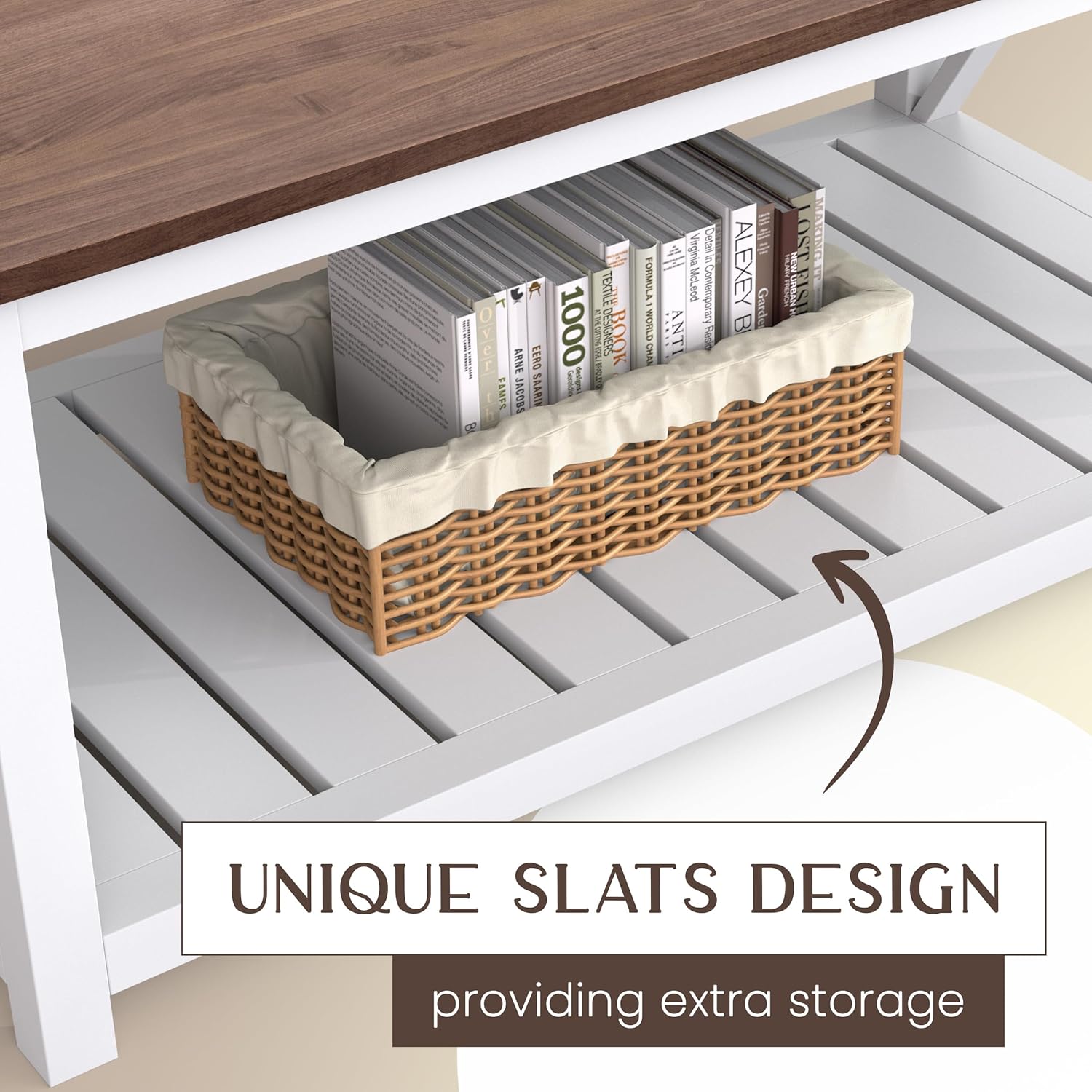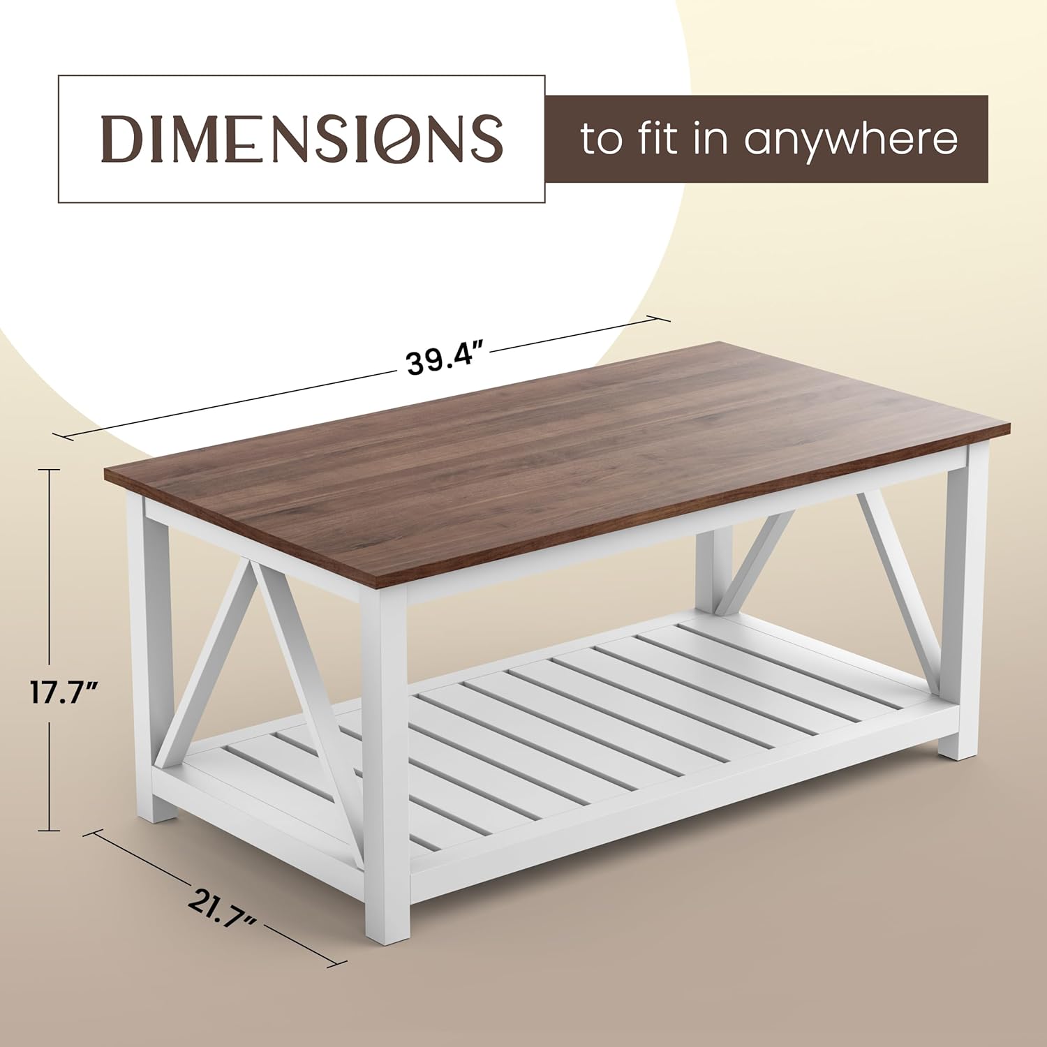 40" Farmhouse Coffee Table | Vintage Rustic Wooden Coffee Table with Lower Shelf for Living Room, Dorm, Office, Bedroom Center Table - Brown